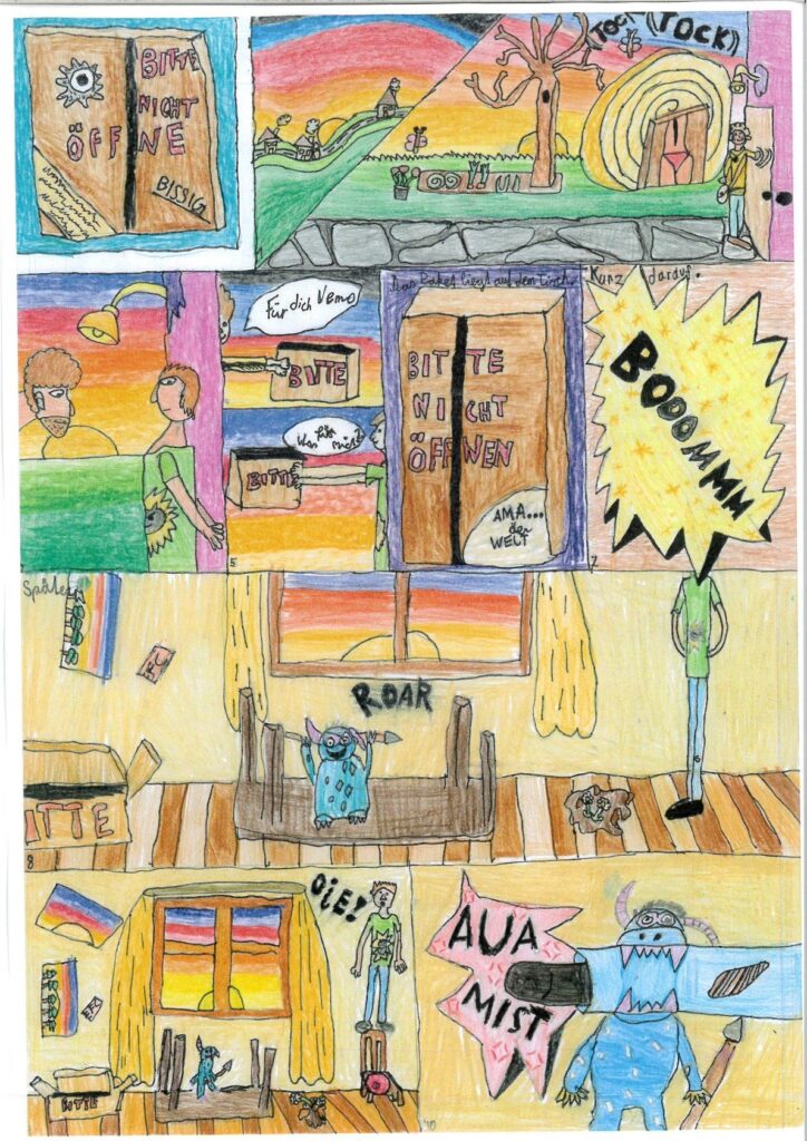 Die Idee des Wettbewerbs war, ein Buch aus der Schulbibliothek als Grundlage für einen Comic auszuwählen und künstlerisch zu gestalten.