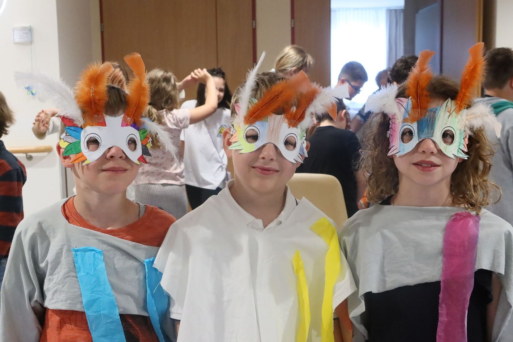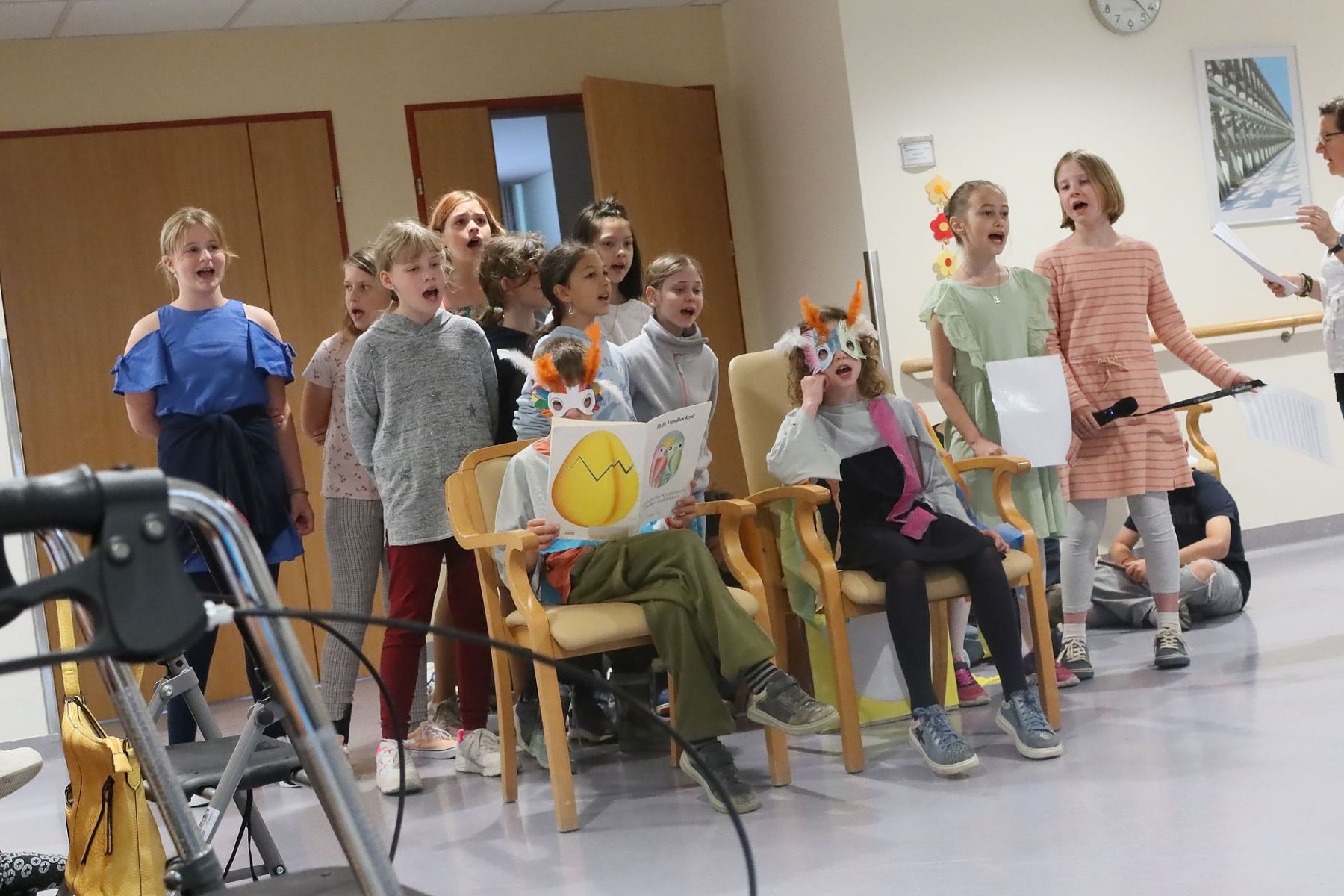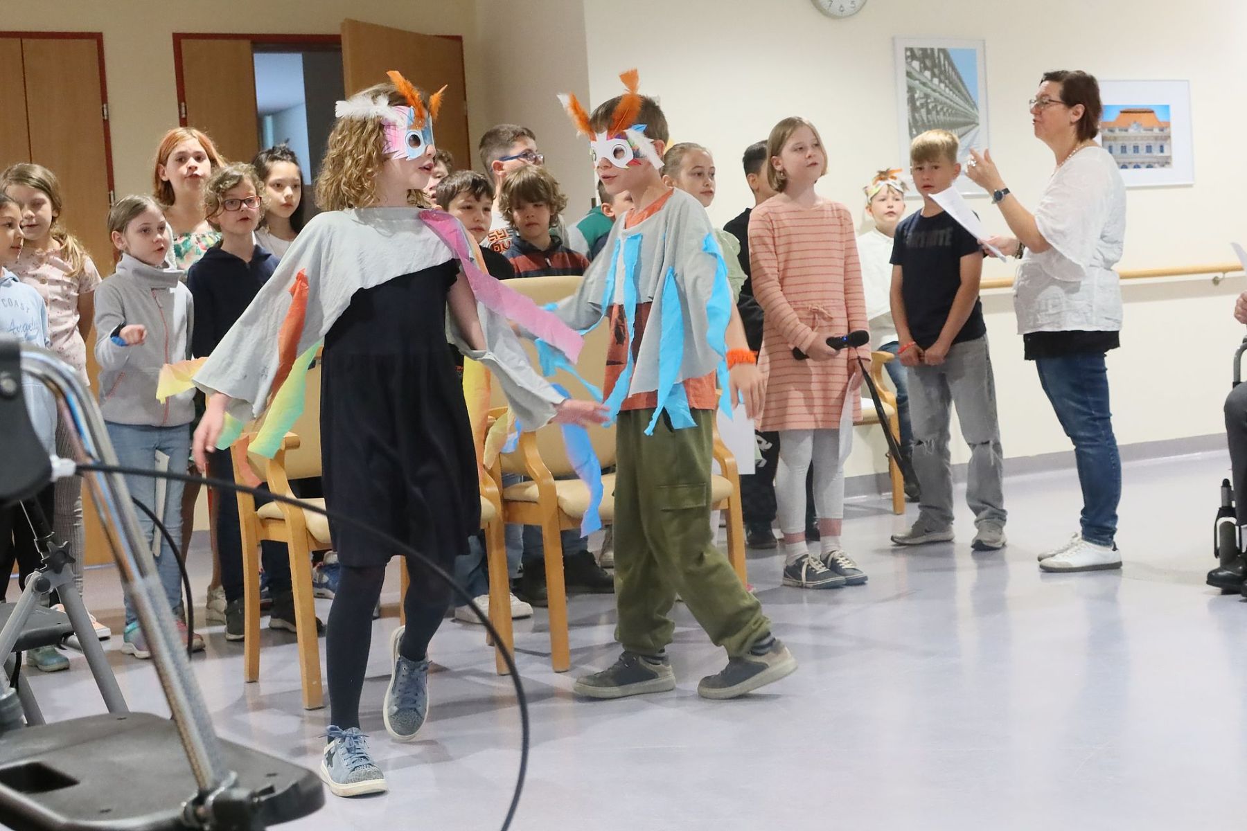 Am 17.05.2024 begeisterte die 3b unter der Leitung von Frau VOL Gabriele Kautz die Bewohnerinnen und Bewohner des Wohnbereichs 4 des Rosenheims Tulln mit der Aufführung des Kindermusicals „Die Vogelhochzeit“ von Rolf Zuckowski.